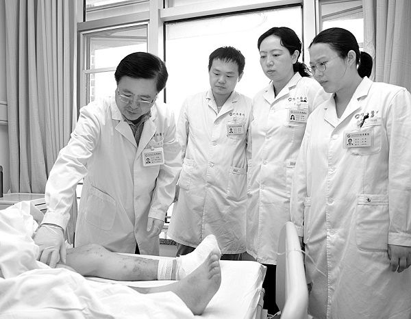 图为医院多学科血糖管理团队查看患者恢复情况。