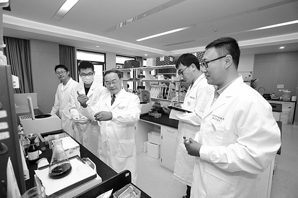 上海市分子影像学重点实验室主任黄钢(左三)就核医学探针的分子机理研究,对团队进行指导。(作者供图)