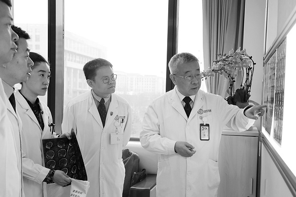 在联合门诊,江涛院士(右一)带领多学科专家分析患者影像资料。(医院 供图)