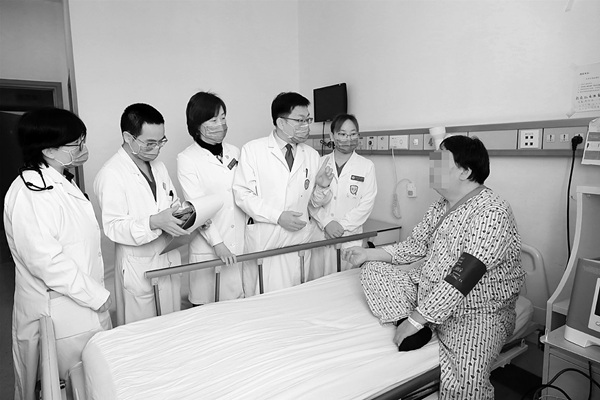 韩芳教授(左四)带领团队查房。 (医院 供图)