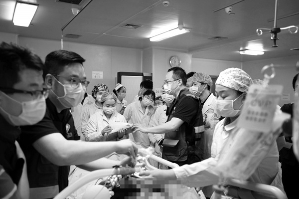 金晓东教授(右二)带领团队抢救群体伤重症伤员。(医院供图)