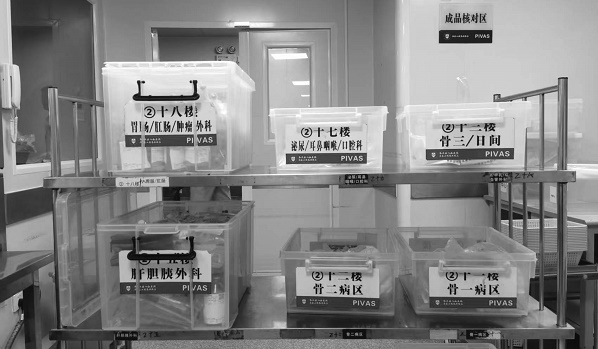 在长兴县人民医院静脉用药调配中心中,等待发往各病区的输液成品。本报记者 吴刚 摄