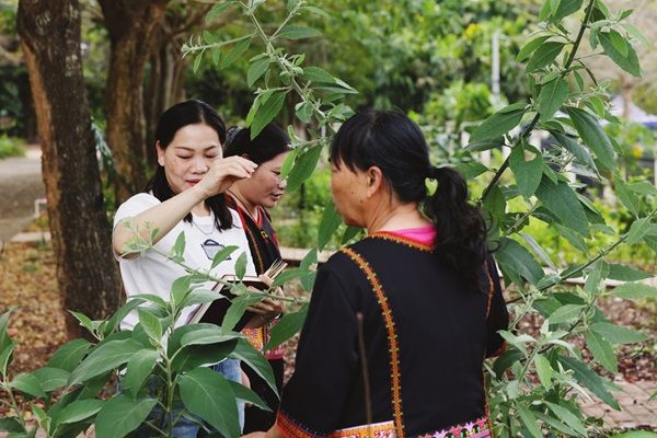 2月20日,在白沙县人民医院茶城院区的黎族药园内,韦小丽(左一)与园区工作人员察看药材生长情况,并交流黎医药发展与保护现状。