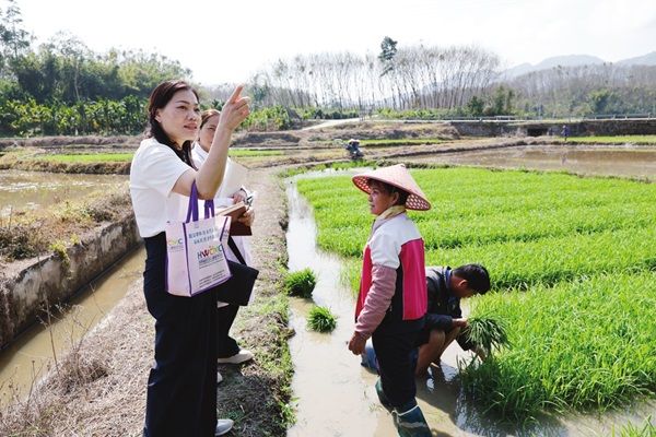 2月20日,在白沙县牙叉镇营盘村田间,韦小丽(左一)与村民交谈,了解村民最关心的卫生健康问题。