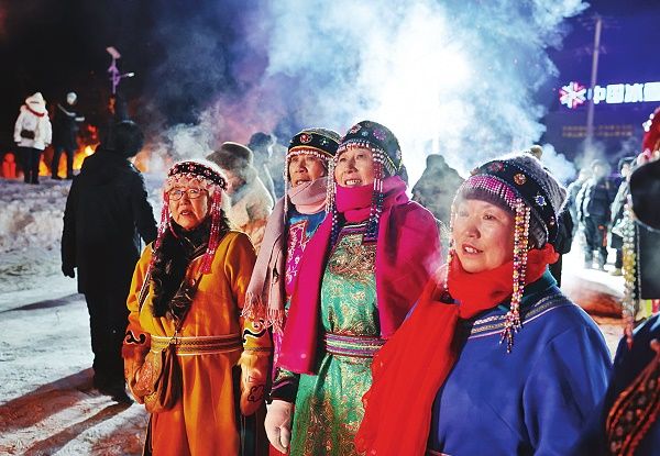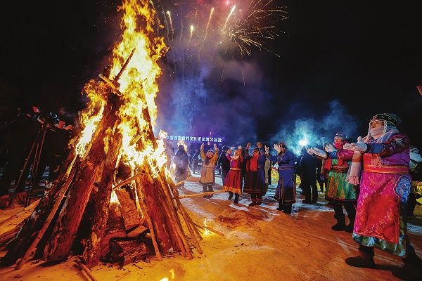 伴随着烟花绽放和欢快舞蹈,游客们沉醉在这份独特的冰雪文化与民族风情中。