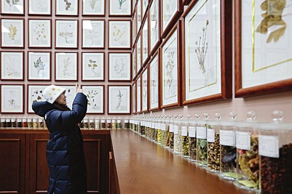 2024年12月27日,在新生鄂伦春族乡兴安岭道地药材博物馆内,游客用手机记录下兴安岭道地药材的标本介绍。