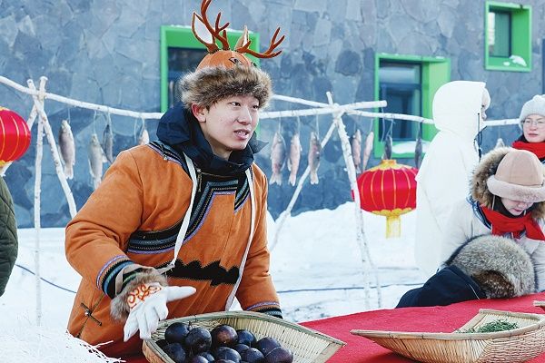 2024年12月27日,身穿鄂伦春族传统服饰的工作人员在新生村村口迎接为村民义诊的北京医疗专家。