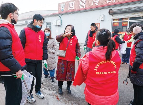 2月5日,天津市宁河区秋萍巾帼志愿服务队队长李秋萍(左四)在芦台大集旁的卫生死角,给志愿者安排清扫任务。