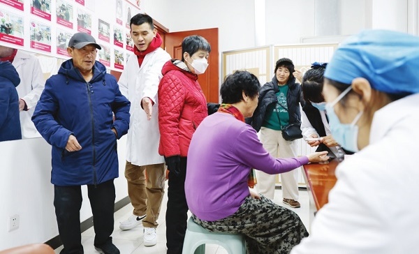 2月3日,北京市通州区通运街道紫荆雅园社区健康小屋内,医护人员为居民进行健康检查,居民们有序排队等候。