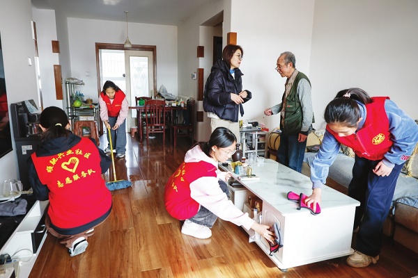 2月5日,天津市宁河区芦台街道顺驰兴业社区的志愿者走进独居老人家中,为老人打扫房间。
