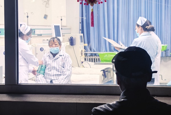 王锦虎望着血液透析室内的张爱珍。本报记者 吴风港 摄