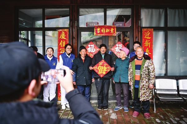 2月4日,北川羌山雄鹰健康护卫队来到北川县第二养老服务中心,为这里贴上火红的春联。贴完春联后,队员们与老人合影。