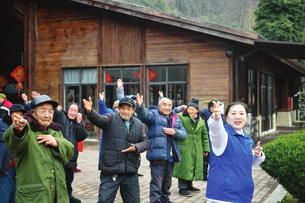 2月4日,北川羌山雄鹰健康护卫队队员带领北川县第二养老服务中心的老年人进行锻炼。