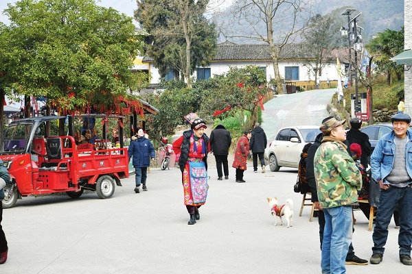 2月4日,曲山镇石椅村,一位身穿羌族服饰的村民接受体外冲击波治疗后,表情轻松地离开了义诊现场。
