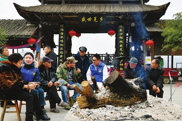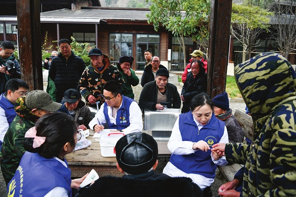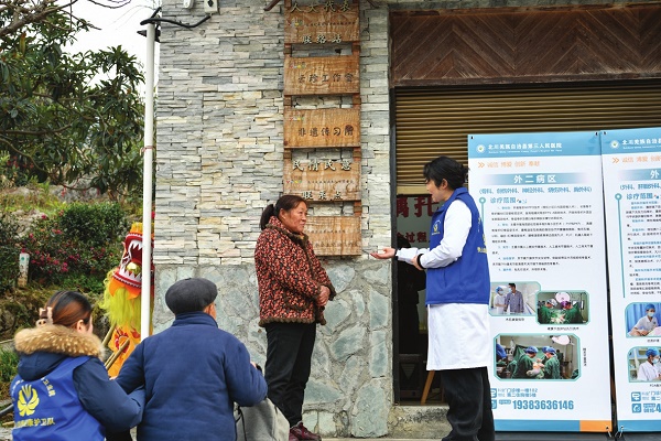 2月4日,北川羌山雄鹰健康护卫队来到曲山镇石椅村,支起义诊“摊位”。不少村民围坐烤火,与医护人员交流健康话题。