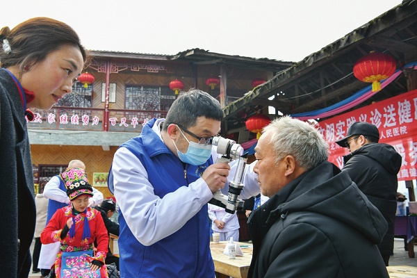 2月4日,北川羌山雄鹰健康护卫队到曲山镇石椅村开展义诊活动,医务人员为村民进行眼科检查。