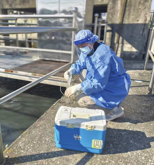 云南省昆明市西山区疾控中心传染病防治科科员张亚谋在昆明市第十三水质净化厂采集水样。