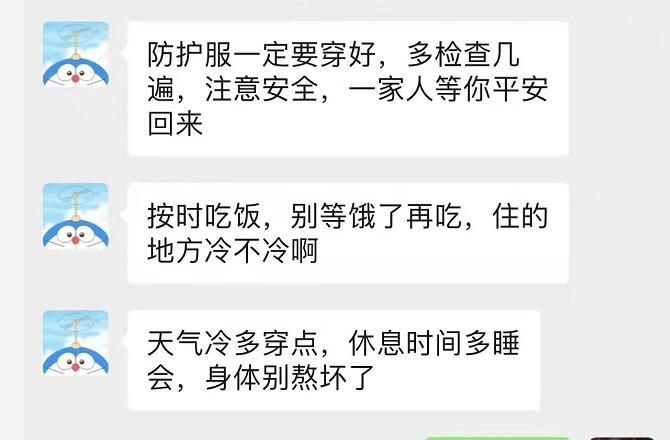 “防护服一定要穿好,多检查几遍,注意安全,一家人等你平安回来。”