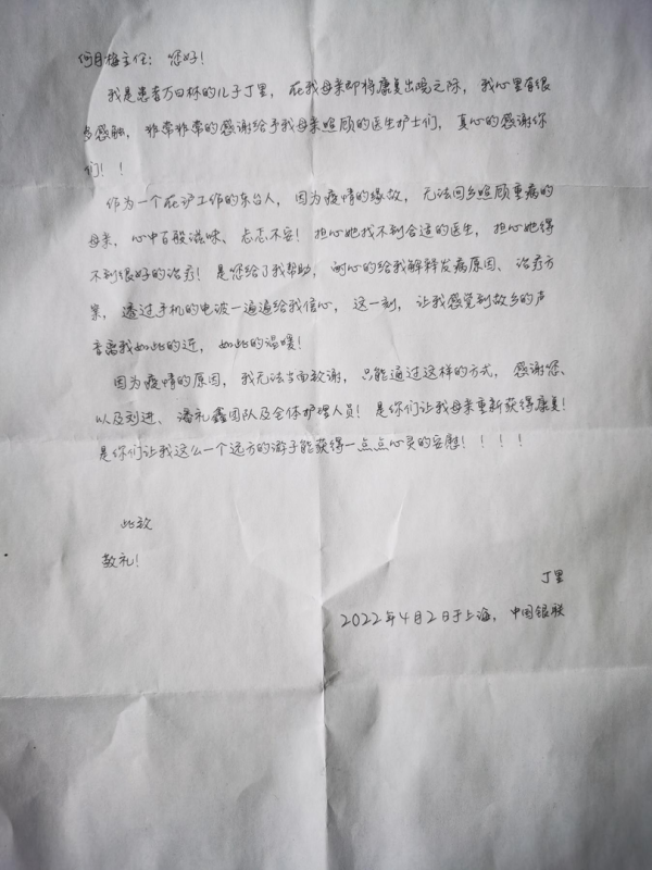 “作为一个在沪工作的东台人,因为疫情的缘故,无法回乡照顾重病的母亲,心中百般滋味、忐忑不安!担心她找不到合适的医生,担心她得不到很好的治疗,是您给了我帮助,耐心地解释发病原因、治疗方案。这一刻,让我感觉到故乡的声音离我如此近,如此温暖!”万奶奶的儿子在感谢信中写道。