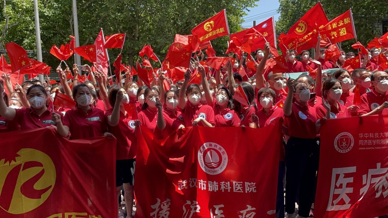 5月31日,武汉市肺科医院等多家医院的援沪医疗队员在离沪前齐唱《歌唱祖国》