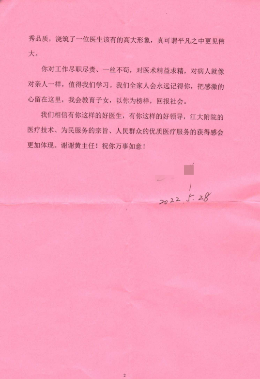 “信是我写的,前两天我和儿子女儿还去医院送了锦旗,只是没能见到黄主任。我还会跟他约时间见一面,一定要当面表达我们全家人的感激之情!”