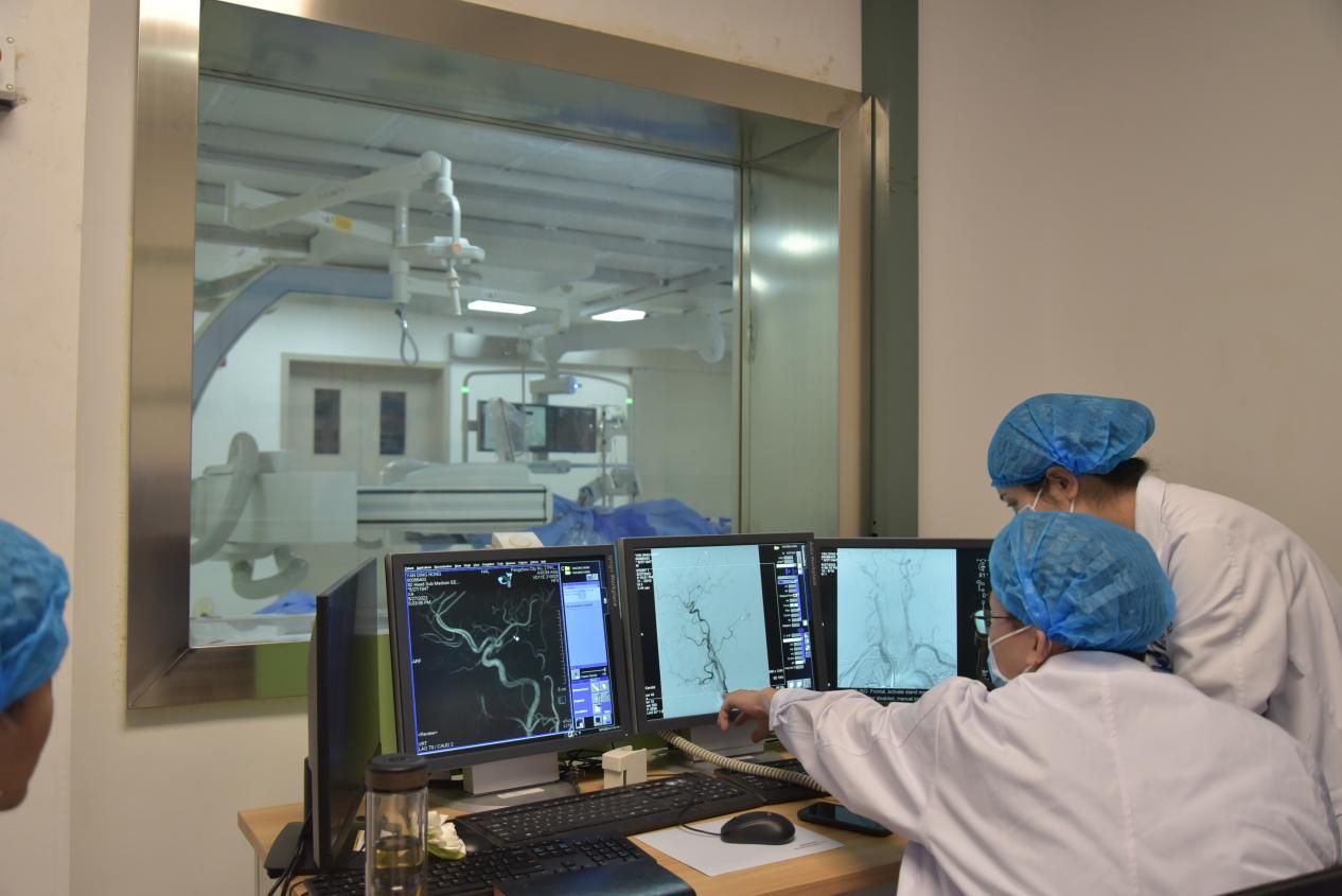 介入中心医生观看患者脑血管造影结果