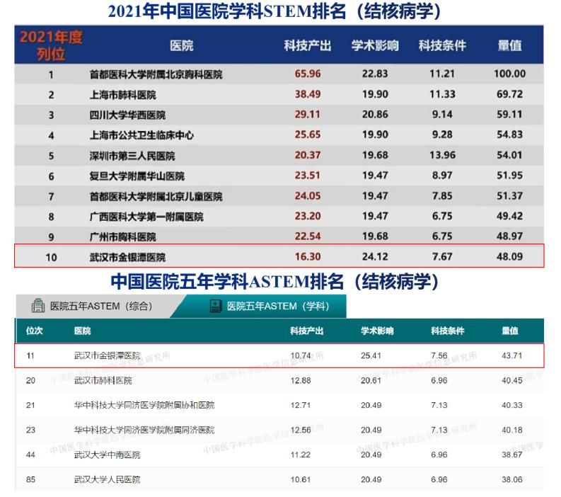 8月4日,中国医学科学院发布2021年度中国医学院校/中国医院科技量值(STEM)排名。湖北省武汉市金银潭医院结核病学首次位列第10名。传染病学(25名)、呼吸病学(40名)、胸外科学(49名)名列前50名,创历史最高水平。另外,在5年总科技量值排名中,医院结核病学排名全国第11名,居湖北省榜首。