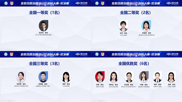 经过激烈的角逐,浙江大学医学院附属邵逸夫医院赵冬冬获得全国一等奖;首都医科大学附属北京天坛医院王婷、南方医科大学南方医院增城分院李春喜获得全国二等奖;重庆医科大学附属第三医院邢祥菊、福建医科大学附属第一医院范奇超、首都医科大学附属北京佑安医院贾琳获得全国三等奖;湖南省岳阳市中心医院李茜、北京大学第三医院李秋钰、重庆市公共卫生医疗救治中心吴玉珊、贵州医科大学附属医院李璨、岳阳市中心医院邓蓉、江苏省人民医院张群获得全国优胜奖。