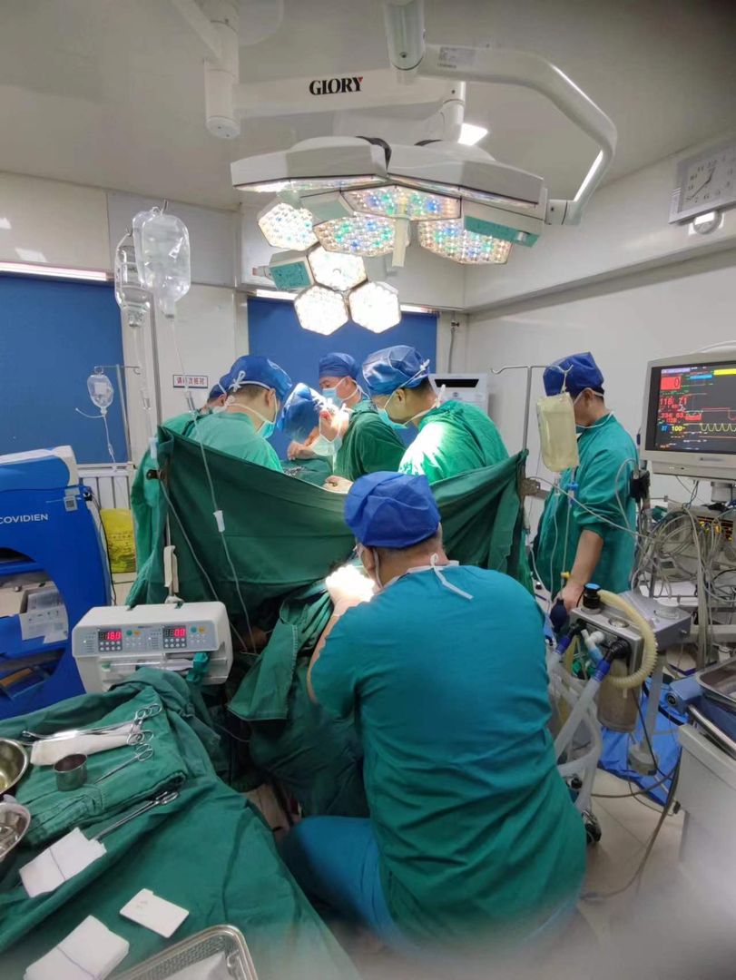 患者头面、手臂、胸腹部多发开放性刀刺伤口10余处,大网膜外露,因大量失血已休克。医生对患者行急诊手术,普外科医生探查腹腔发现,患者小肠破裂、肠系膜破裂出血、膈肌破裂、肝脏破裂,腹腔内有积血约1000毫升。在探查过程中,患者血压再次下降,输血科第一时间将血液送至手术室。医生及时为患者行肠切除吻合、膈肌及肝脏破裂修补止血,神经外科及口腔科同时为患者行头皮及颌面外伤清创缝合。