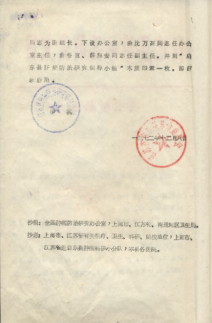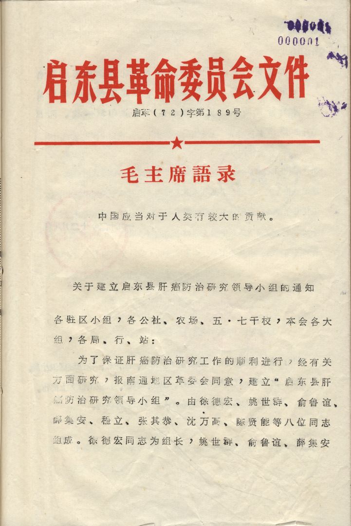新中国建立初期,医疗事业百废待新,我国迫切需要对肿瘤疾病进行专业研究。20世纪70年代初,启东肝癌高发的现象引起了地方政府、医务科研人员的关注。1972年12月8日,“启东县肝癌防治研究领导小组”成立,工作机构设在原来的启东县卫生防疫站内,启东肝癌防治研究所就此成立。