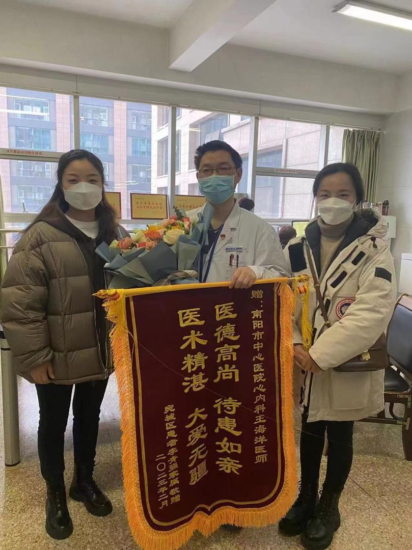 2月10日9时25分,河南省南阳市中心医院心血管内科一病区来了一对漂亮的姐妹花。她们是患者李大爷的女儿,特地送来写着“医德高尚、待患如亲,医术精湛、大爱无疆”几行烫金大字的锦旗,感谢心血管内科一病区副主任医师王海洋及全体医护人员对其父亲的精心治疗与护理。