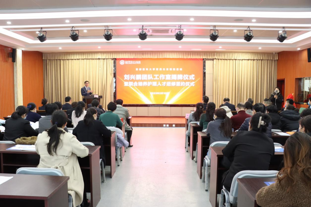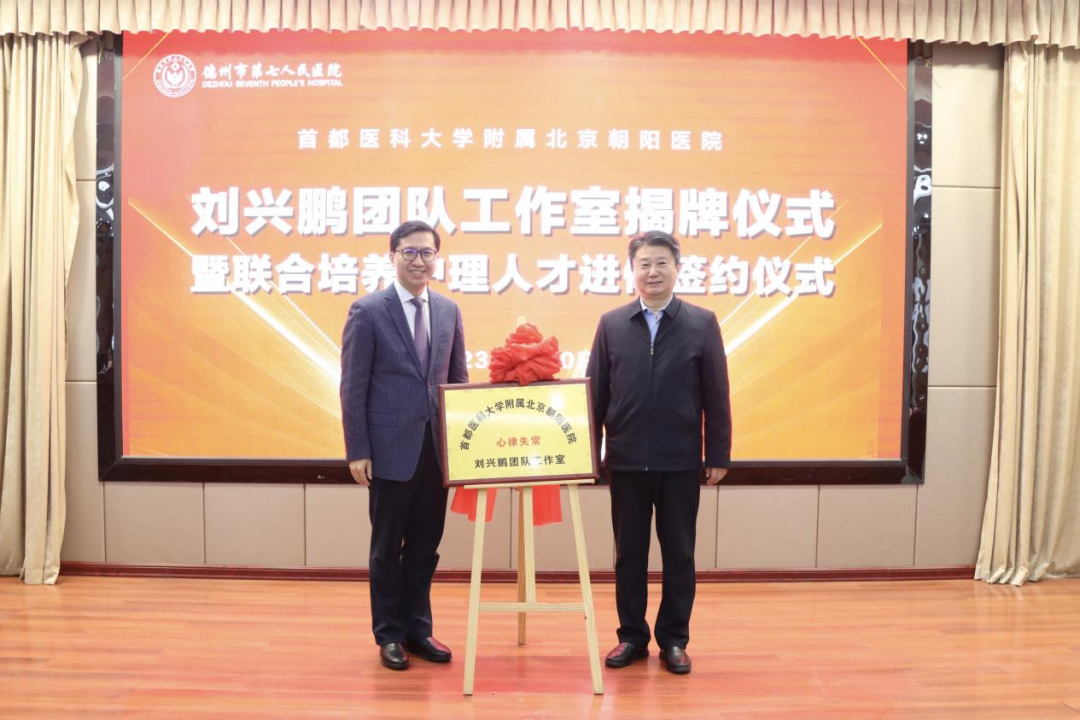 2月10日,首都医科大学附属北京朝阳医院刘兴鹏团队工作室揭牌暨联合培养护理人才进修签约仪式在山东省德州市第七人民医院举行。德州市卫生健康委副主任宋学谦、首都医科大学附属北京朝阳医院心脏中心副主任刘兴鹏、德州市第七人民医院党委书记翟学军及部分领导班子成员,以及医院部分中层管理人员参加活动。