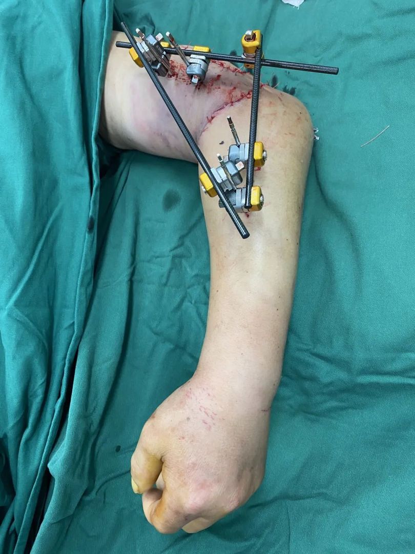 因为医生要切除血管、神经、肌肉等受损组织,所以需要骨短缩以满足血管、神经、肌肉吻合条件,尤其是整体肢体离断,骨短缩会更多。但因患者离断面位于肘关节,只能行肘关节融合术。考虑到肘关节融合术后,患者肘关节无法活动,医生最终选择通过血管移植术实现断肢再植。血管移植术须在不进行骨短缩的情况下完成,加大了手术难度,对医生的技术水平要求也更高。通过手术团队7个小时的努力,手术顺利完成。术后,患者离断肢体血运良好,并成活。