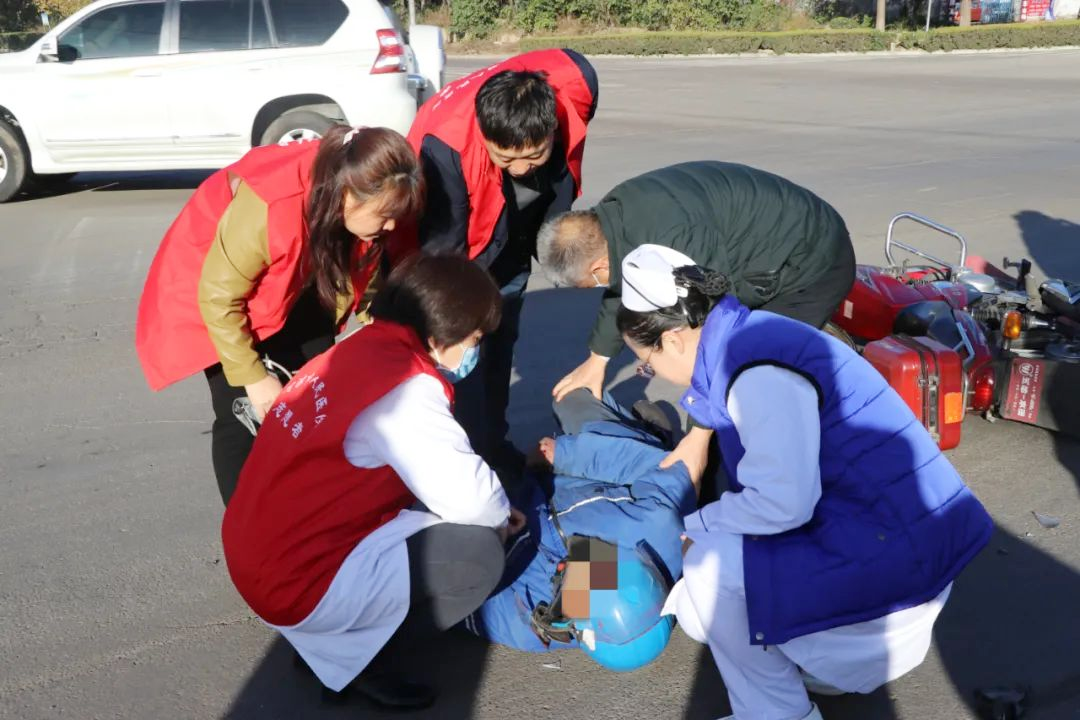 在场党员立即组成救护小组,分工协作开展救治。赵康民迅速为伤者检查伤情,发现其已出现神志不清后,他指导伤者采取正确卧位以减少伤害;杨倩为伤者查看瞳孔、测量脉搏;王永春、杨晓莹为其测量血压,并进行言语安抚;张晓为伤者检查了肢体受伤情况;曹越在现场指挥、疏导交通,避免造成二次伤害。