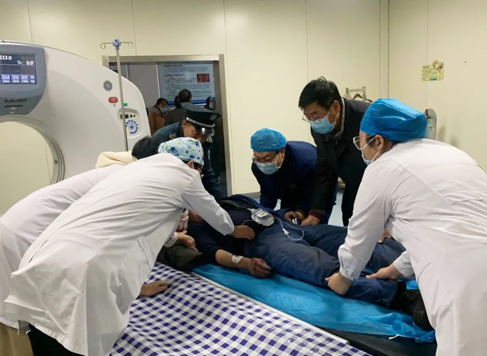 山西省人民医院常驻河津市人民医院专家、急诊科主任杜贤荣立即为该伤者开通救治“绿色通道”,并第一时间汇报医院总值班人员,在没有家属陪同情况下,由医院总值班人员签字后紧急开展救治。在急诊进行电子计算机断层扫描(CT)检查后,伤者迅速入住该院神经外科病房。