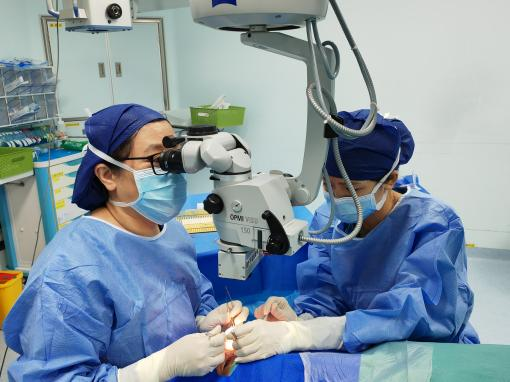 为恢复德吉的眼位,防止斜视对其骨骼造成进一步影响,并尽早帮其建立正确的眼视觉功能,钟晖组织深圳市儿童医院眼科医护团队进行了疑难病例讨论,决定由吕秀芳主任主刀,在显微镜下为德吉进行斜视矫正术。术中,医护团队为其进行了左眼下斜肌切断并转位、右眼下斜肌切断和部分切除、双眼内直肌后徙及左眼外直肌缩短。