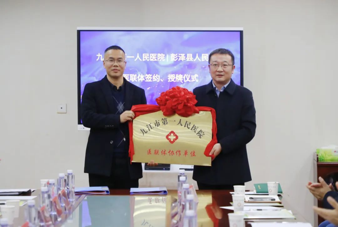 近日,江西省九江市第一人民医院党委书记何剑锋、副院长唐尤佳、欧阳霆、王惠玲,以及党办、院办、外联办、医务处、护理部、信息处、宣传处等部门负责人一行,前往江西省九江市彭泽县人民医院考察交流,双方共同举行医联体签约授牌仪式。彭泽县委书记欧阳明华出席会议并致辞,副县长李桂英主持会议。彭泽县卫生健康委党委书记、主任冯锦华,彭泽县人民医院党委书记何贵兵及该院班子成员参加仪式。