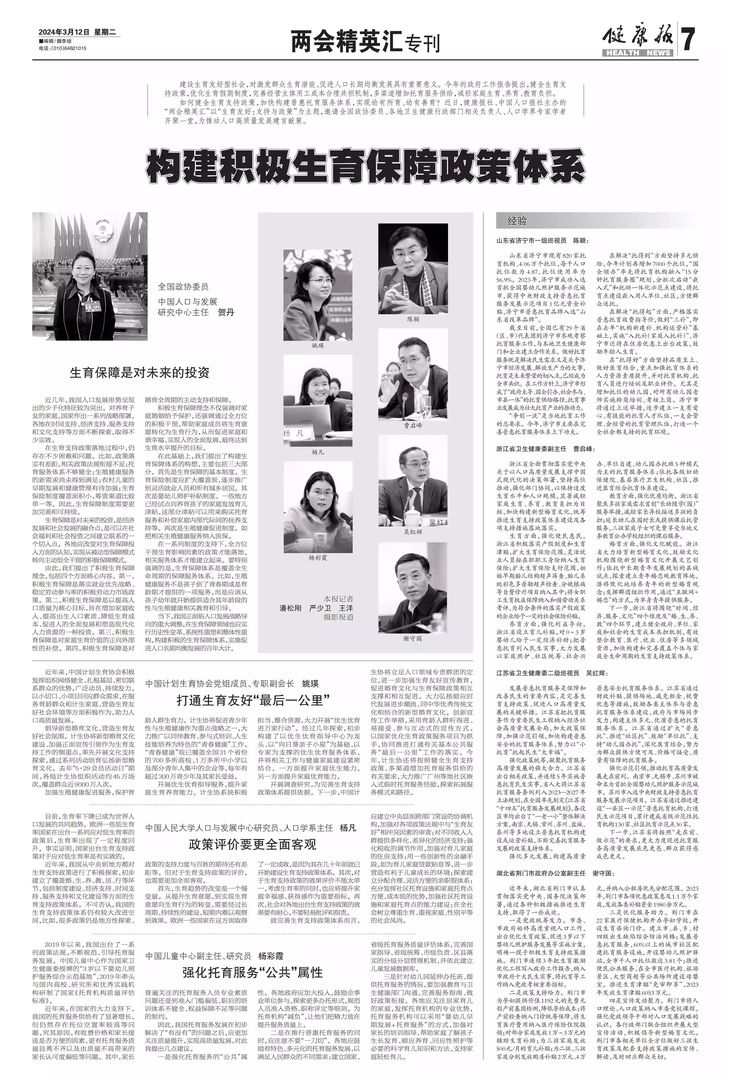 如何健全生育支持政策,加快构建普惠托育服务体系,实现幼有所育、幼有善育?近日,健康报社、中国人口报社主办的“两会精英汇”以“生育友好:支持与政策”为主题,邀请全国政协委员、各地卫生健康行政部门相关负责人、人口学界专家学者齐聚一堂,为推动人口高质量发展建言献策。