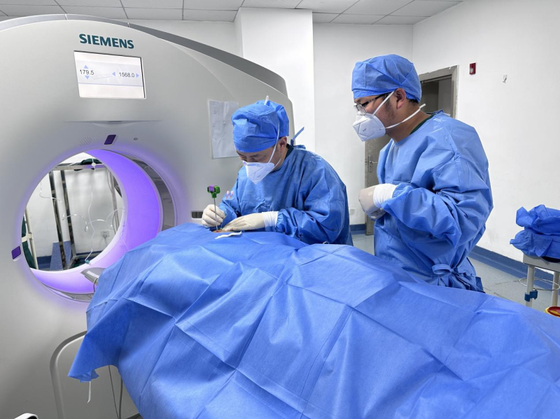 陈师傅3年前在其他医院确诊肺癌并进行了手术,遗憾的是术后一年,肺癌复发且出现转移。之后,他接受了放疗和化疗,但一直无法有效控制肿瘤蔓延。不久前,陈师傅转院到武汉市肺科医院。该院外科、肿瘤科联合会诊发现,肺癌已转移至右后上纵隔。该院肿瘤科主任李铭介绍,患者复发的病灶毗邻主动脉、心脏、食道、气道、脊髓等重要器官、组织,且患者肾功能不好,无法接受化疗。一年前,患者此部位曾接受过放疗,周围组织对放疗的耐受力极差,如若再放疗,常规剂量难以达到治疗效果。权衡利弊后,该院肿瘤科与外科联手为患者进行了碘125粒子植入。
