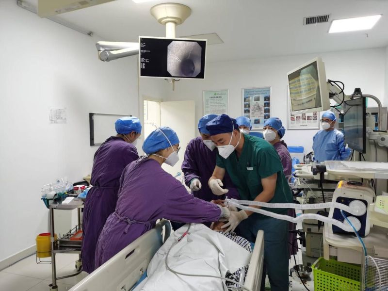 在武汉市肺科医院副院长、华中科技大学同济医学院附属同济医院副教授、副主任医师魏双的主持下,呼吸介入科、肿瘤科、麻醉科、重症医学科等的多名专家开展了讨论,为王先生制订了周密的救治计划,核心方案便是经血管介入进行肿瘤药物灌注及止血治疗,再经气管镜介入开通左主支气管,实施肿瘤消融治疗并置入支架,为患者左主支气管架起坚固的“钢结构隧道”,恢复左肺通气。