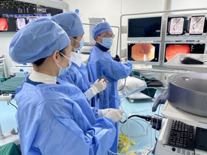 据悉,这项技术是在ERCP(经内镜逆行胰胆管造影术)的基础上,将一根比手机充电线还细的胆道子镜经口腔顺着传统十二指肠镜(母镜)通道,插入胆总管内。这样,医生就能在无射线的直视下进行取石操作。“这就好比在胆管内安置了一间微型、精准的‘手术室’,让医生能够直视病灶,精确地碎石取石。”舒苗江介绍,相比于常规的腹腔镜技术,这种治疗方式更加微创。2月26日,经充分术前准备后,舒苗江为K女士顺利进行了手术。
