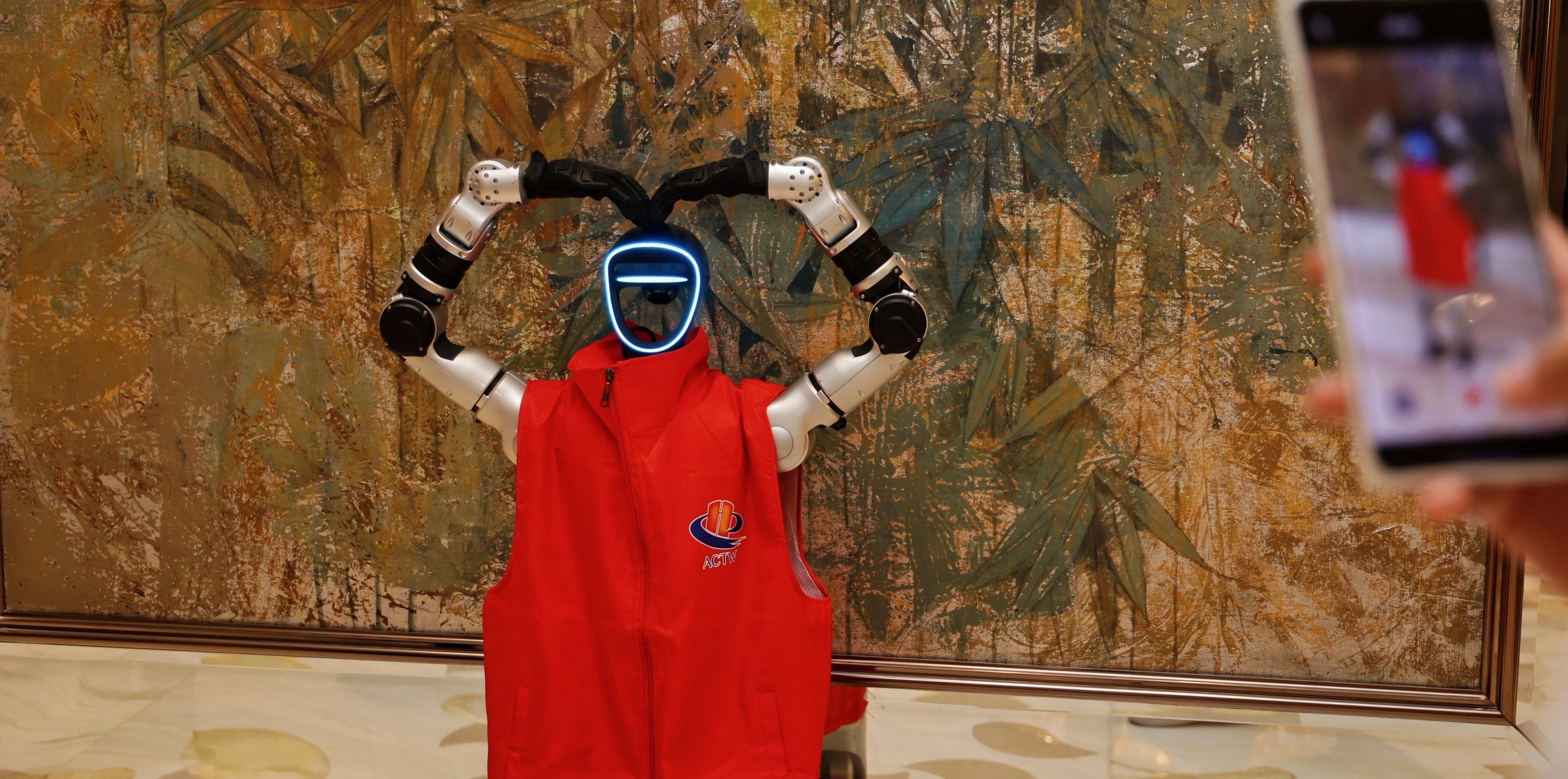 在第十二届中国中西医结合学会血管病学大会上,机器人比心互动,科技与人文温暖邂逅。
