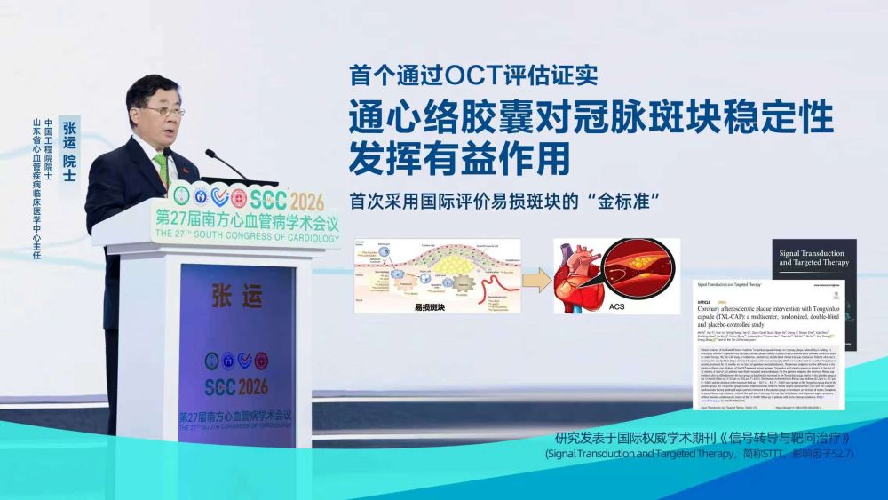 3月20日,第27届南方心血管病学术大会在广东省广州市拉开帷幕。这场心血管领域的学术盛会汇聚众多行业专家,探讨前沿诊疗理念。会上,中国工程院院士张运作题为《通心络胶囊干预冠状动脉粥样硬化斑块的多中心、随机、双盲、安慰剂对照研究》的学术报告,介绍了通心络胶囊的最新科研成果。研究结果显示,在他汀类药物等现代标准治疗基础上联合使用通心络,可增加急性冠状动脉综合征患者冠状动脉易损斑块纤维帽厚度,减小斑块脂质弧度,并改善心绞痛症状,为临床稳定冠状动脉斑块提供了相关研究参考。
