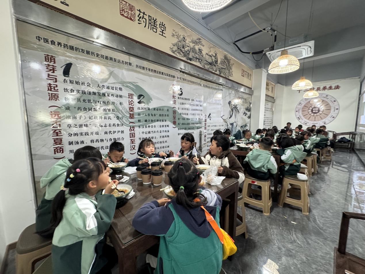 师生们在药膳堂共同品尝药膳米线、五行养生小笼包、养生茶叶蛋等特色膳食