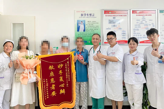 在患者李大爷出院的当天,其家属为心血管内科副主任李琛及其带领的TAVR团队成员送上锦旗与鲜花。锦旗上一句质朴的“妙手复心瓣,敞扉患者安”包含了太多的感谢与敬意。