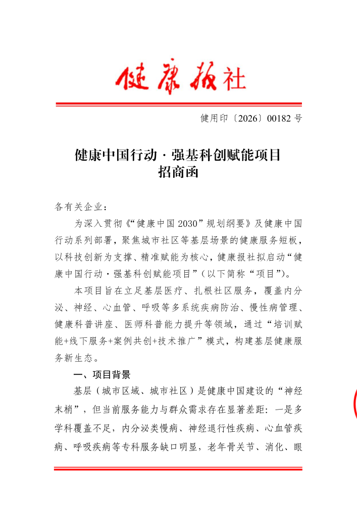 {"id":"509284","toptitle":"","toptitle_color":"","title":"健康中国行动・强基科创赋能项目招商函","title_color":"","subtitle":"","subtitle_color":"","crtime":"2026-03-04 16:13:28","condition":"来源: