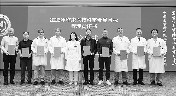 阜外华中心血管病医院党委书记郭智萍(左五)代表医院与各临床医技科室签订发展目标管理责任书。(阜外华中心血管病医院供图)