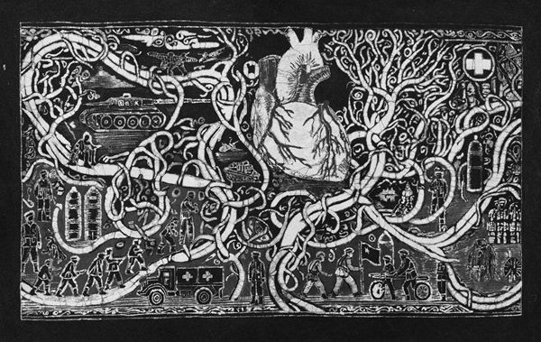 画面中央,一个巨大的心脏被血管紧密环绕,这些血管仿佛是战场上各个生命线的延伸,连接着前线与后方,代表着红十字医疗队为前线士兵提供紧急救治的使命。