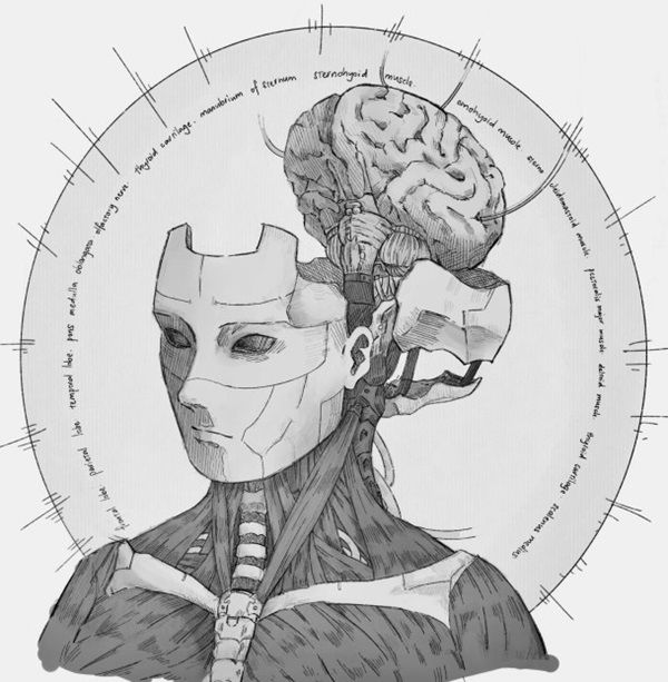 《壳与我》的主题是“解剖认识自我,科技改进自我”。医学解剖打开了解析人体结构的大门,而作者在这幅画中重新审视了“人”这个概念。当人体机能逐渐被仿生化,人类拥有了金属的脊椎、3D打印的骨骼、电子的神经元件,我们是否还能在仿生的血与肉中找到那独特的代表人类的自我?