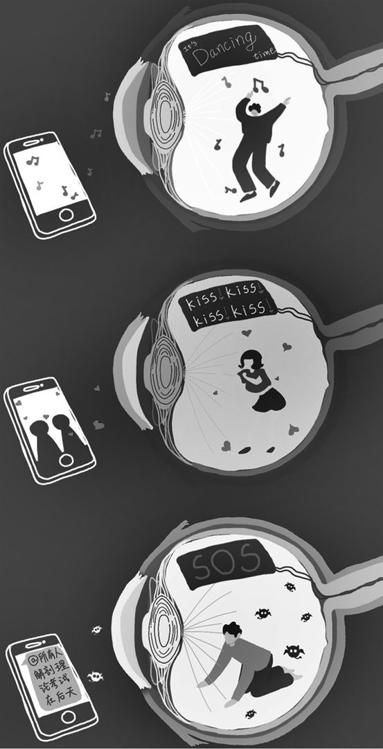 作者想象在医学生的眼睛玻璃体中有一群活泼的超现实小人。在期末周这一特殊时期,当主人“摆烂”休息,小人看到手机里有趣好玩的内容,比如视频、甜甜的恋爱事件时就会兴奋欢呼、手舞足蹈,将一些快乐的信息通过信号传入大脑。然而,当考试通知突然降临,整个玻璃体“宇宙”瞬间就被紧张和恐惧所笼罩,小人绝望倒地。